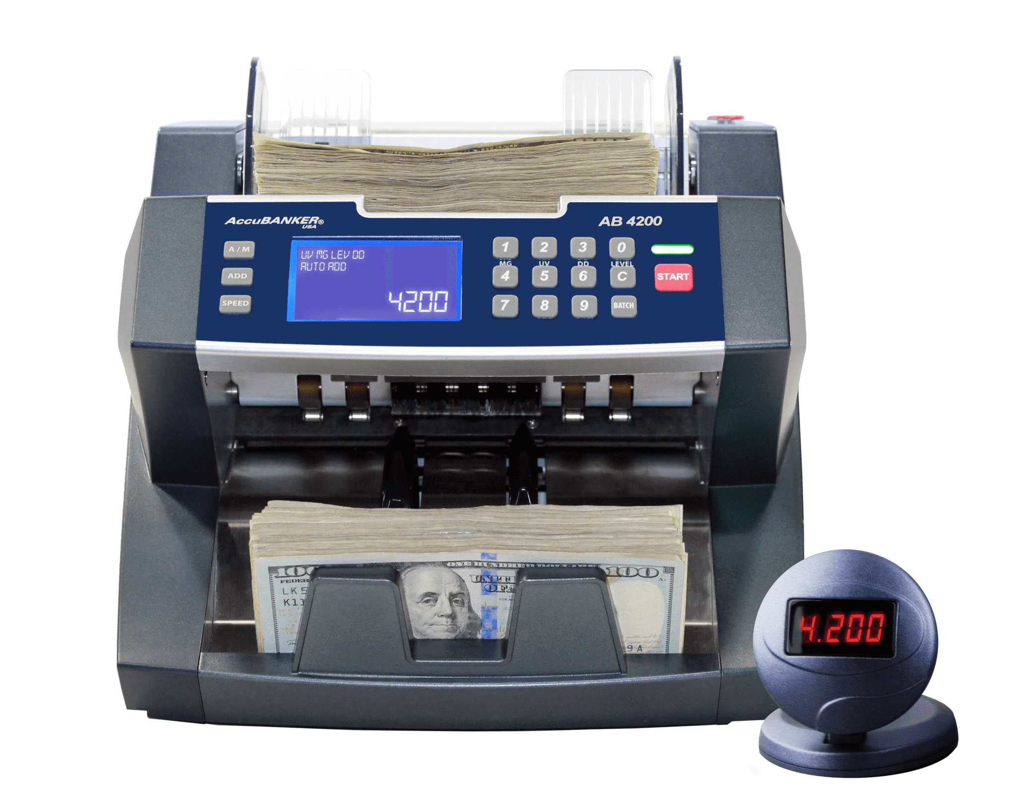The AB4200 is a heavy-duty bank grade money counter designed for any type of business, ranging from small retailers to large sized stores. This is a user-friendly machine with front-loading capabilities allowing the user to easily add bills while the machine counts them. This saves time and reduces significant losses due human errors during the counting process. This unit is can be equipped with counterfeit detection functions including ultraviolet and magnetic ink detection. The AB4200 provides the user with accurate and adjustable counting speeds as quick as 1800 bills per minute. The user can be notified with a visual and audible alert when double bill, suspicious bill size, and chained bills are detected.